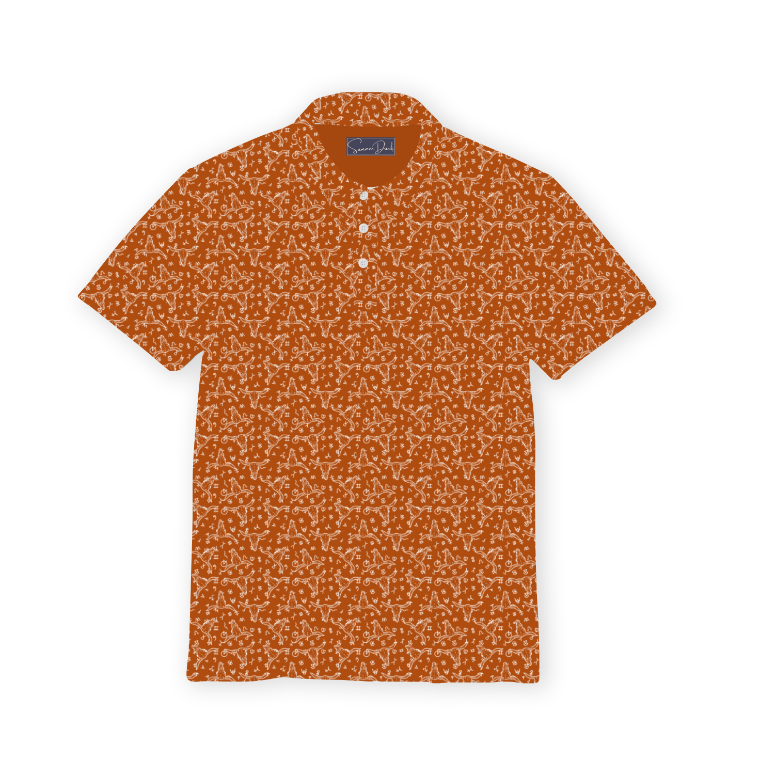 Stand out in bold style with The Barton Polo. Featuring a rich orange base patterned with longhorn and cattle imprints, this polo keeps you sharp and comfortable with its lightweight fabric and modern fit. Perfect for game days, golf outings, or casual wear.