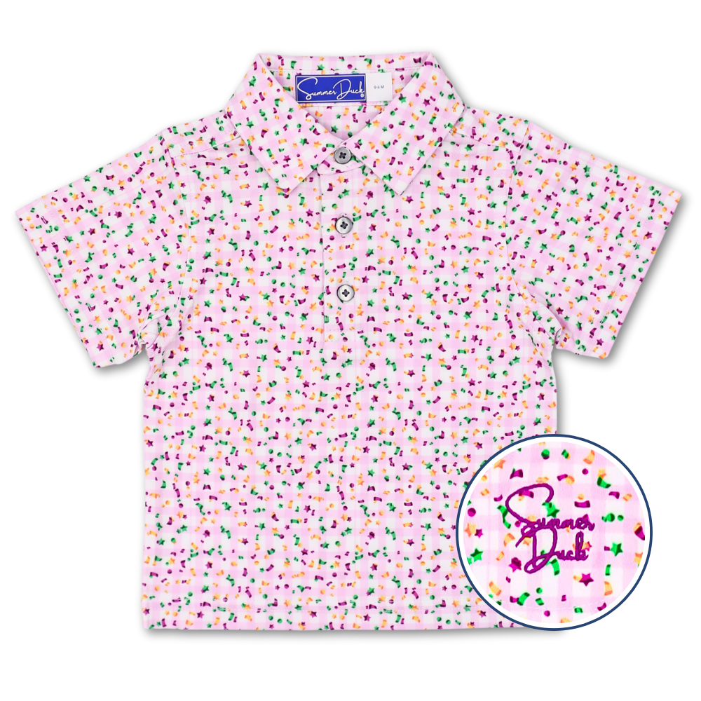 ✔ Mardi Gras-Inspired Fun – A vibrant confetti print makes this polo perfect for celebrations and everyday play.